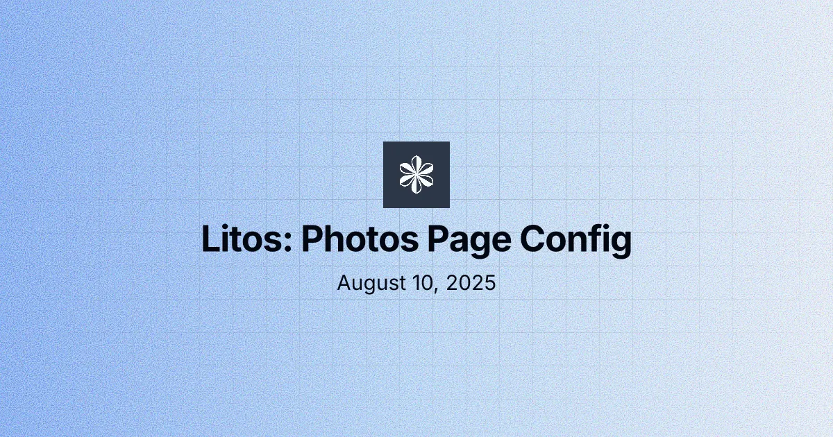 Read more August 10, 2025 Litos: Photos Page Config Configure Photos page: page texts (PHOTOS_CONFIG), file locations, and usage examples. REC LitosDocumentation Read more