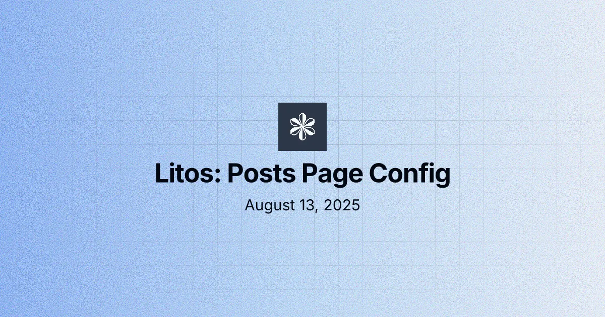 Read more August 13, 2025 Litos: Posts Page Config Complete Posts configuration: fields, list styles, post metadata layouts, OG image handling, frontmatter examples, markdown syntax, and expressive-code config. REC LitosDocumentation Read more